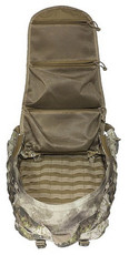 großes, weit zu öffnendes RV-Hauptfach mit: Hydrationfach, 3 RV-Netztaschen und 8 Reihen Molle-Streifen auf der Rückenseite